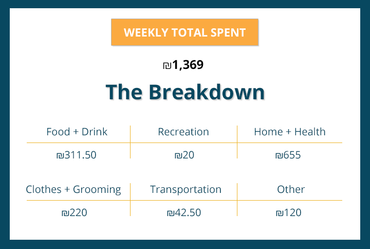 Welcome to Israel Money Diaries. We are asking Olim how they spend their hard-earned money during a one week period — and we’re tracking every last shekel. If you are interested in joining us in this project, please contact [email protected].