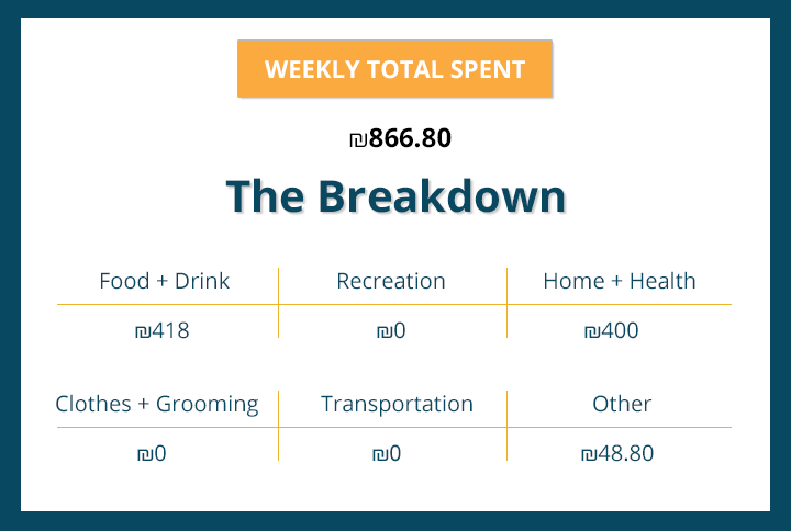 Welcome to Israel Money Diaries. We are asking Olim how they spend their hard-earned money during a one week period — and we’re tracking every last shekel. If you are interested in joining us in this project, please contact [email protected].