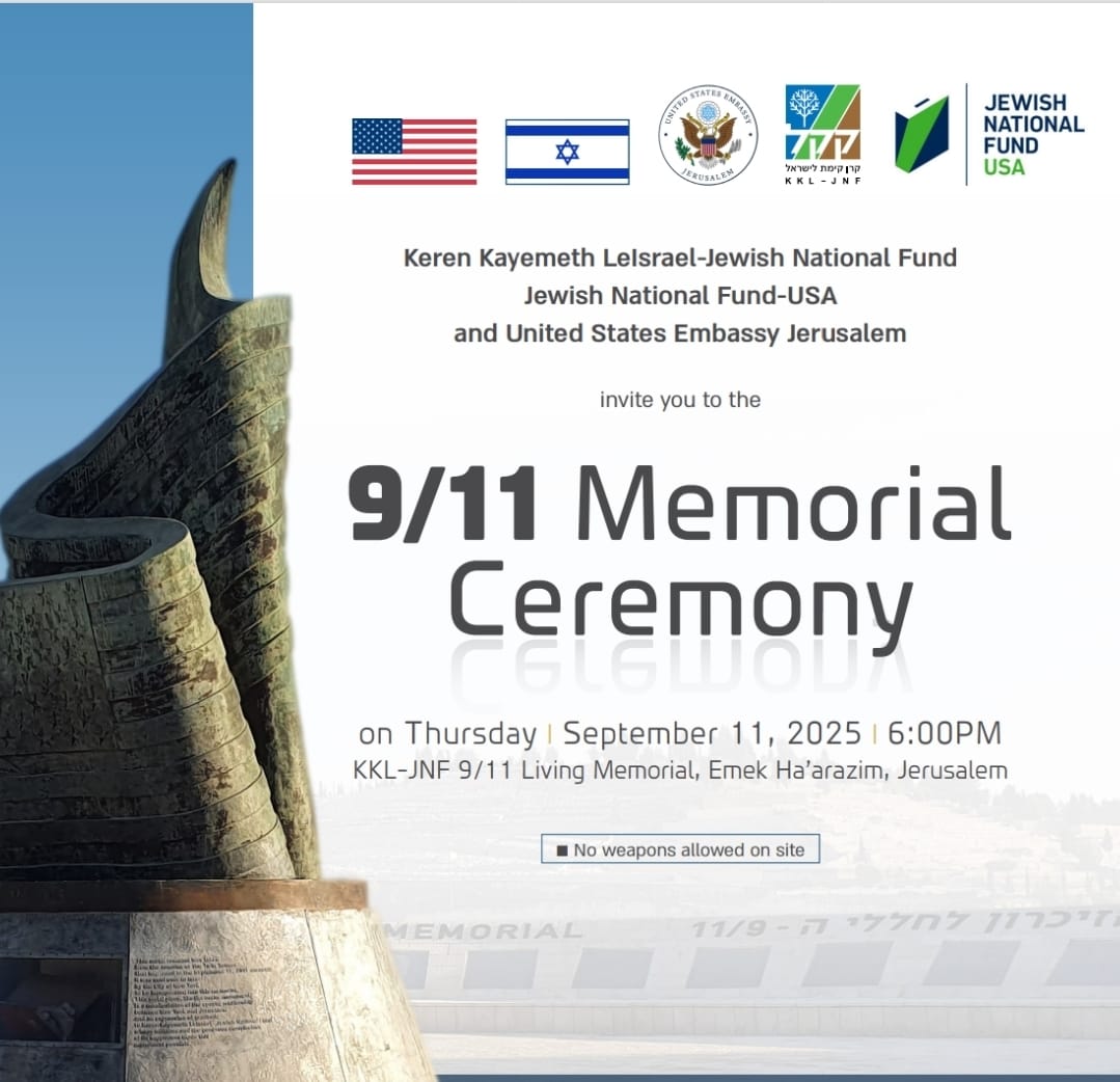 The Jewish National Fund USA, Keren Kayemeth LeIsrael-Jewish National Fund, and The Embassy of the United States of America invite you to the 9/11 Memorial Ceremony on Thursday, September 11, 2025 from 6-7 PM at the KKL-JNF 9/11 Living Memorial at Emek Ha’arazim, Jerusalem.