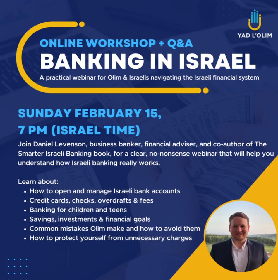 A practical webinar for Olim & Israelis navigating the Israeli financial system Opening a bank account in Israel shouldn’t feel like decoding a secret language — but for many Olim, it does. Join Daniel Levenson, business banker, financial adviser, and co-author of The Smarter Israeli Banking book, for a clear, no-nonsense webinar that will help you understand how Israeli banking really works. You will learn: