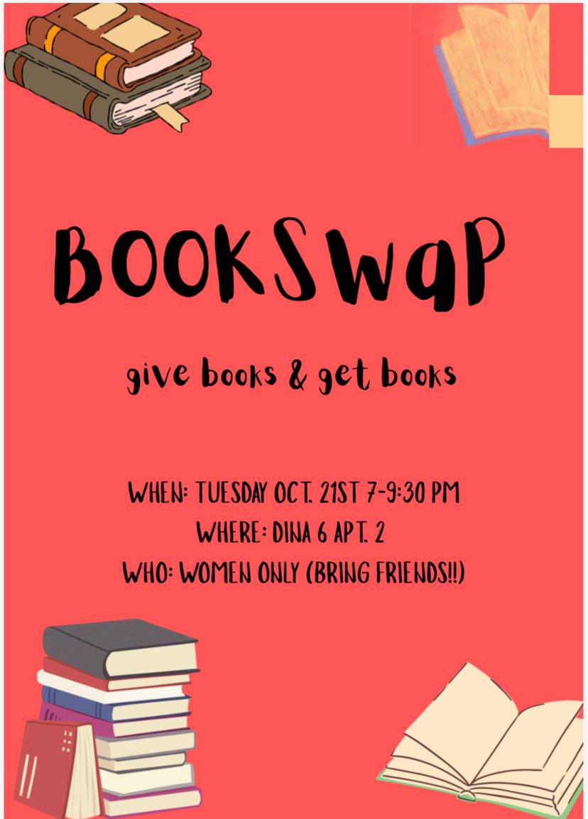 Join us for a Book Swap for women only on Tuesday, October 21st from 7:00–9:30 PM at Dina 6, Apartment 2! Bring a few books you’ve already read (and loved!) to give away or trade, and go home with some new reads, new friends, and good vibes. 🌸 Any books left at the end of the night will be donated, so nothing goes to waste. Feel free to invite your friends — the more the merrier! Don’t forget to sign up on the spreadsheet using this