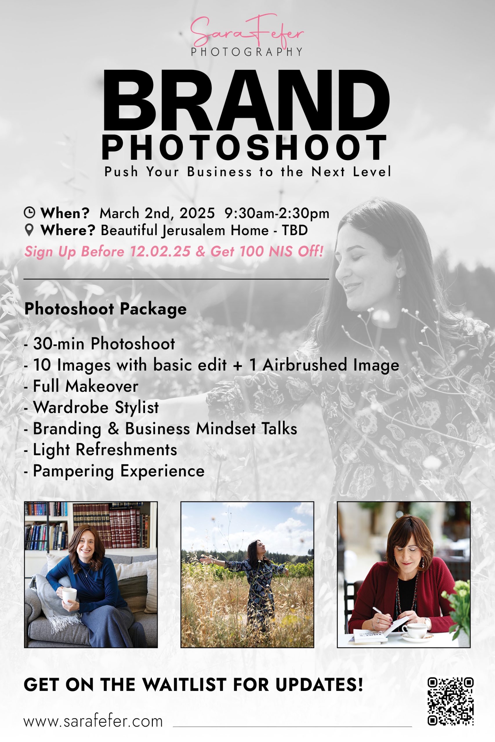 Inviting all female business owners to the Brand Elevation Photoshoot Event. Early bird 100 NIS discount expires today! Feb 12th, 2025.