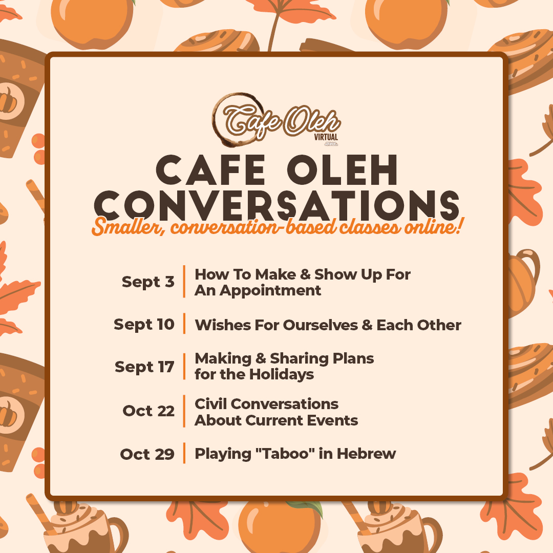 Join us on Wednesdays at 8 pm IST for Cafe Oleh Conversations – a unique opportunity to further improve conversational Hebrew skills with fellow Cafe Oleh participants, and get feedback from the master himself, Jay!