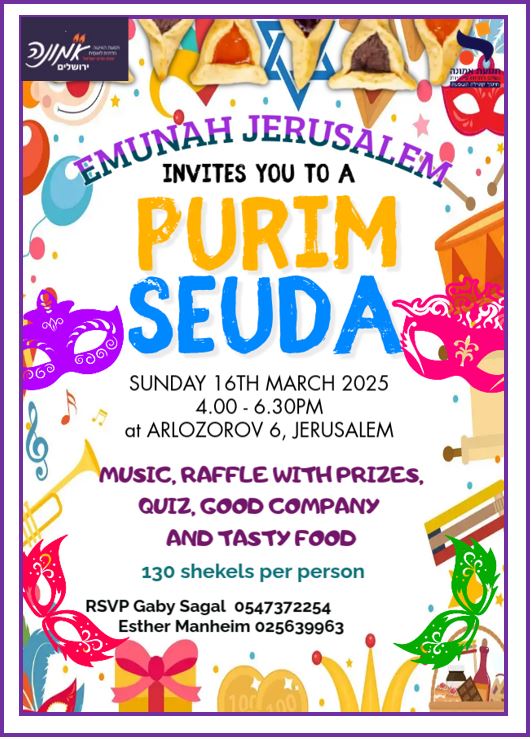 Emunah Jerusalem invites English speaking Olim to a Purim Seuda.