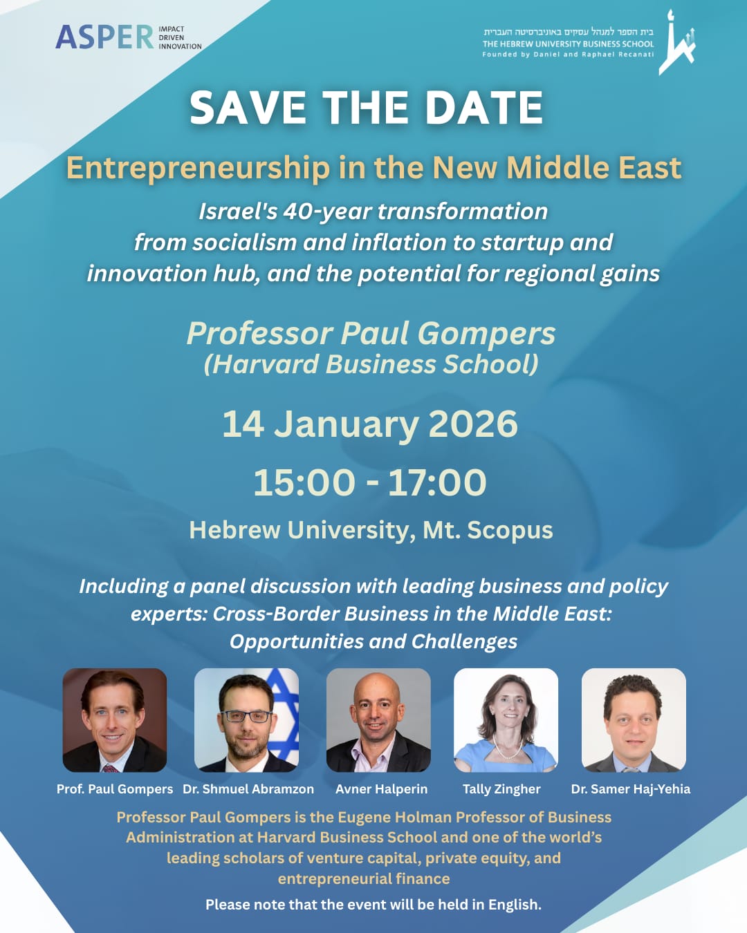 The Asper Center for Entrepreneurship at The Hebrew University Business School is proud to host a lecture and panel discussion on developing forward-looking economic agendas for Israel and the MENA region.