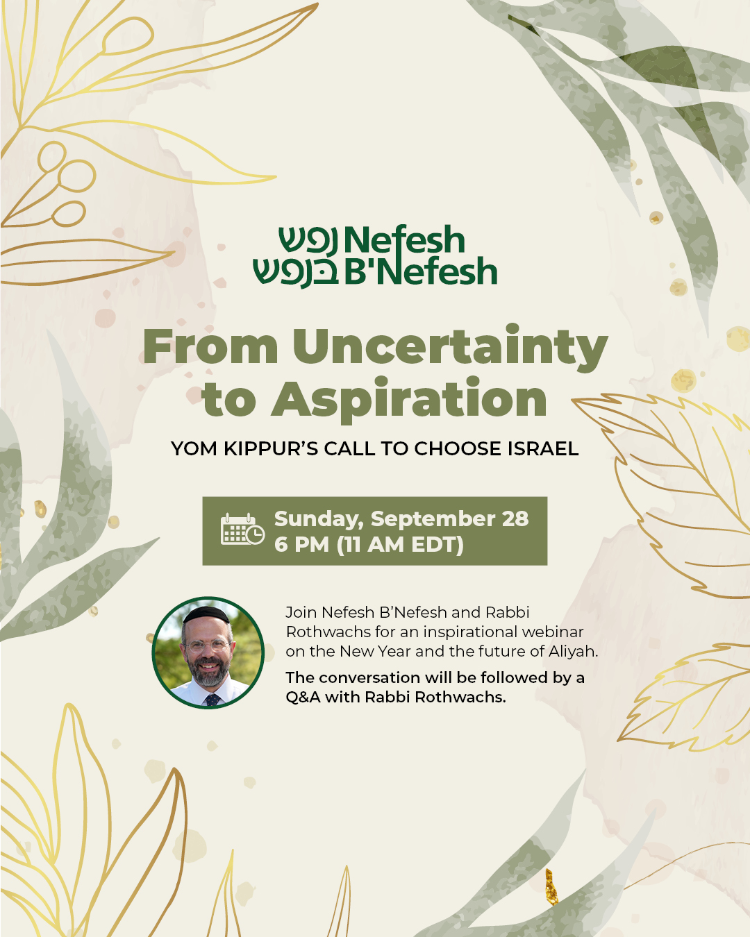 Join Nefesh B’Nefesh and Rabbi Rothwachs for an inspirational webinar on the Yamim Noraim and the future of Aliyah. The conversation will be followed by a Q&A with Rabbi Rothwachs.