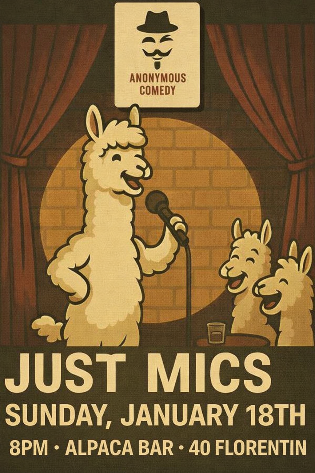 Just Mics: Tel Aviv’s finest English Comedy open mic! Run by Anonymous Comedy TLV. Free entry, Sunday 18.1 , 20:00 at Alpaca!