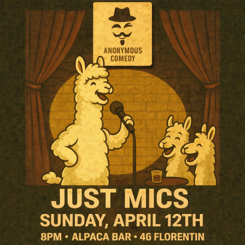 Just Mics: Tel Aviv’s finest English Comedy open mic! Run by Anonymous Comedy TLV. Free entry, Sunday April 12th , 20:00 at Alpaca!