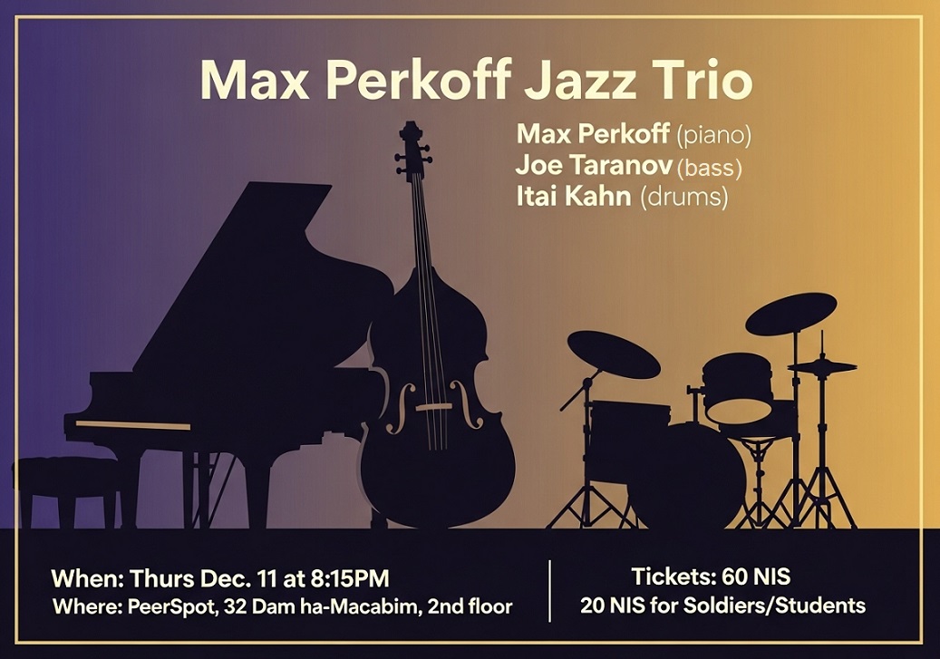 Join us Thursday, Dec. 11 at 8:15 PM in Modi’in for an unforgettable jazz evening with The Max Perkoff Trio at PeerSpot’s new cultural hub!