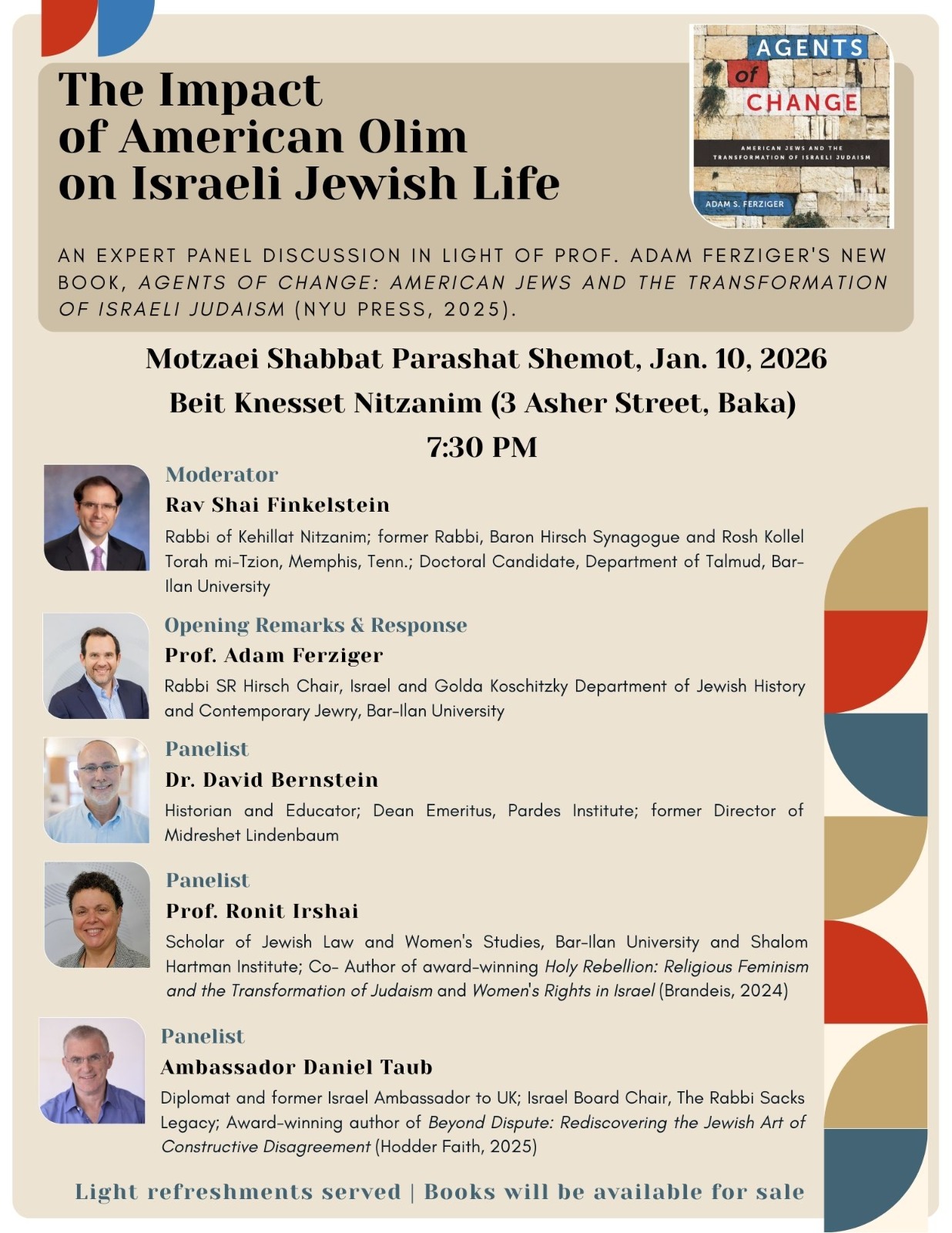 Join us for a thoughtful and timely panel discussion exploring the cultural, religious, and communal impact of American olim on Israeli society. Drawing on the insights of Prof. Adam Ferziger’s new book, Agents of Change: American Jews and the Transformation of Israeli Judaism (NYU Press, 2025), leading scholars and public figures will examine how American Jewish ideas, institutions, and leadership have influenced Israeli Judaism—and how these influences continue to shape Israel today.