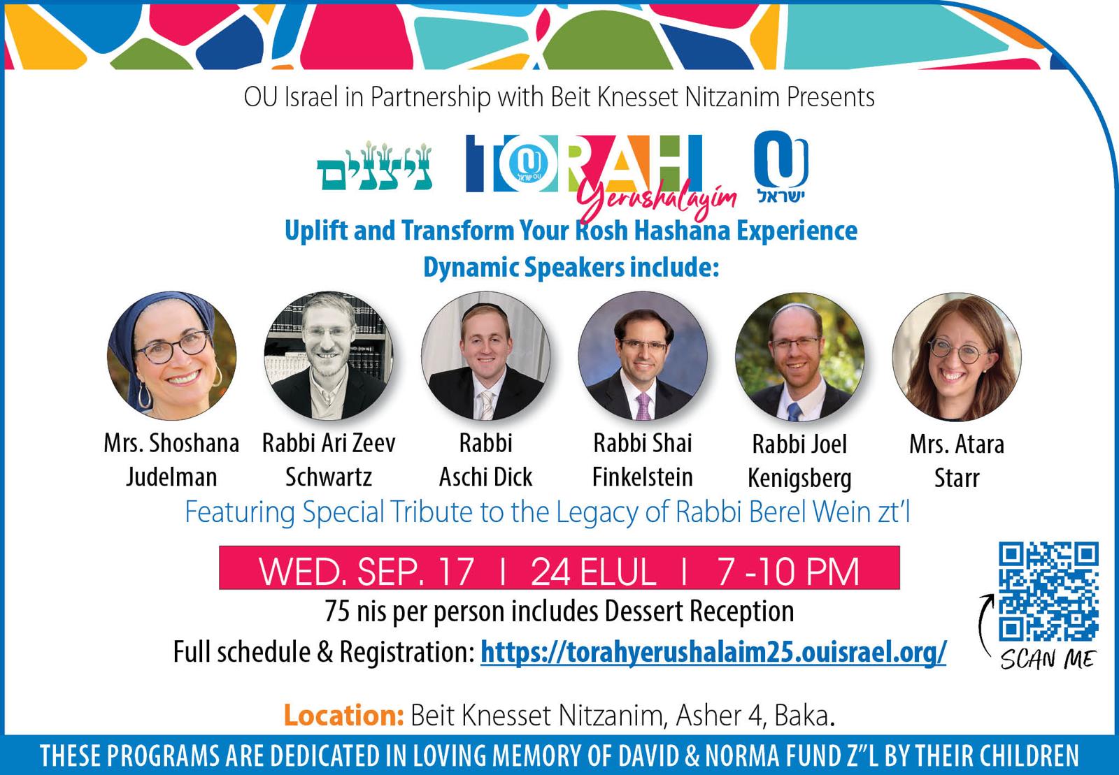 Registration is now open for our annual Torah Yerushalayim Layl Iyun to Prepare for Rosh Hashana, including sessions dedicated to the teachings of Rabbi Berel Wein zt’l on Teshuva, Rav Kook on the Therapeutic Power of Speech, Progeny for Israel’s Fallen Heroes, and more. This layl iyun will feature dynamic presentations by a number of familiar faces, as well additional teachers newer to the OU Israel orbit.