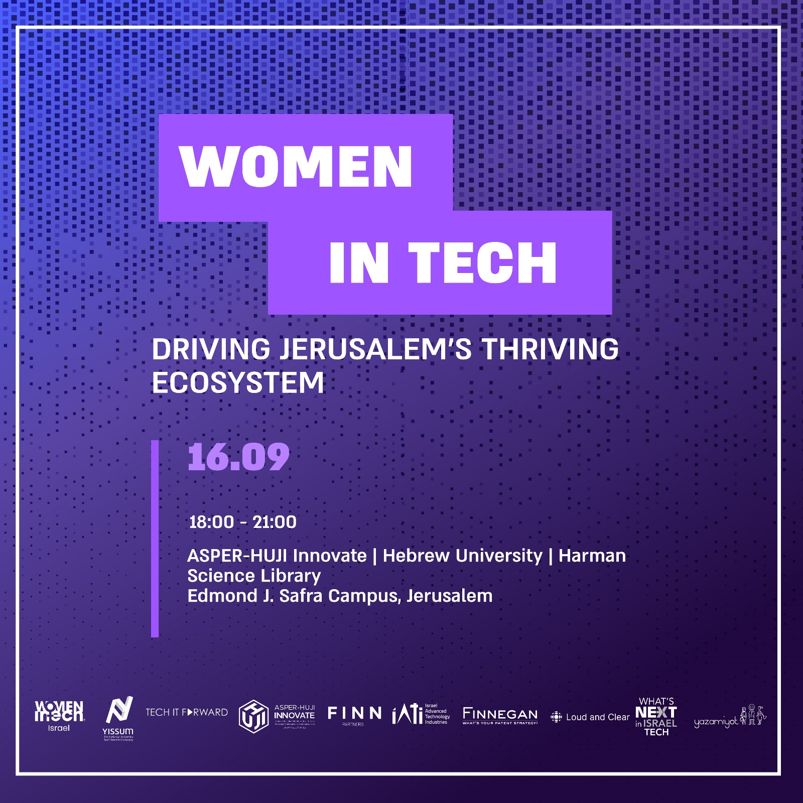Women in Tech® Israel, Yissum, ASPER‑HUJI Innovate and Tech It Forward invite you to experience this unique energy firsthand. Expect an evening of inspiring conversations, meaningful networking and a celebration of the people and ideas driving Jerusalem’s innovation forward.