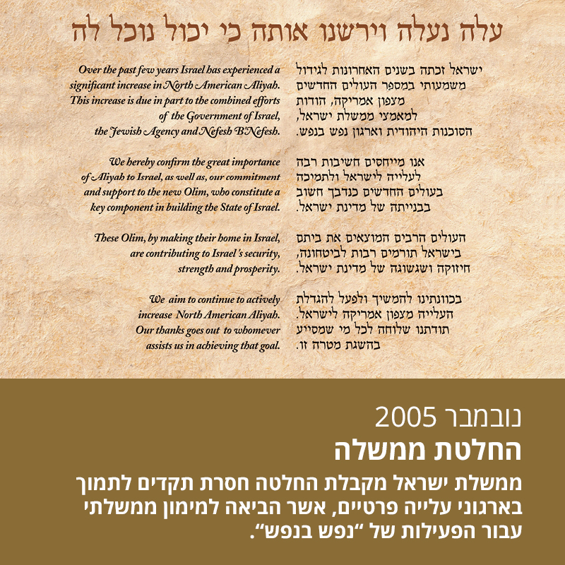 עבור רבים, העלייה לישראל היא מטרה. בנפש בנפש, אנו גם רואים בעלייה כמטרה, אך גם כאמצעי להשגת יעדים ומתן מענה לאתגרים לאומיים רבים. בין אם מדובר על מענה למחסור הגדל ברופאים, פיתוח הפריפריה הגיאוגרפית, חיזוק הקשר עם יהדות התפוצות או שמירה על ביטחון המדינה וטיפוח הכלכלה הישראלית, בנפש בנפש אנו יודעים לתת את המענה הנדרש תוך מימוש החזון הציוני של עלייה לארץ. לא זו בלבד, מחקר שנערך ע"י חברת דלויט מראה כי ההחזר על ההשקעה של מדינת ישראל בעולי נפש בנפש עומדת על כ-420% כאשר ההשקעה הראשונית מוחזרת בממוצע תוך שנה מיום עלייתם לארץ.