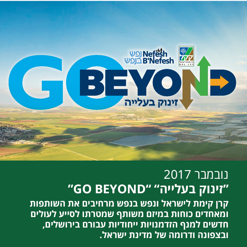 בשנת 2017, נפש בנפש וקרן קימת לישראל החליטו על הרחבת השותפות ביניהם והשקת המיזם המשותף, זינוק בעלייה. במטרה להתגייס למשימה הלאומית של פיתוח צפון ודרום המדינה ובירתה, ירושלים, ומתוך ההבנה שאזורים אלה מציעים עושר של הזדמנויות לעולים דוברי אנגלית, נפש בנפש מעודד ומתמרץ עולים חדשים וותיקים לעבור צפונה, דרומה ולירושלים עם משפחותיהם…