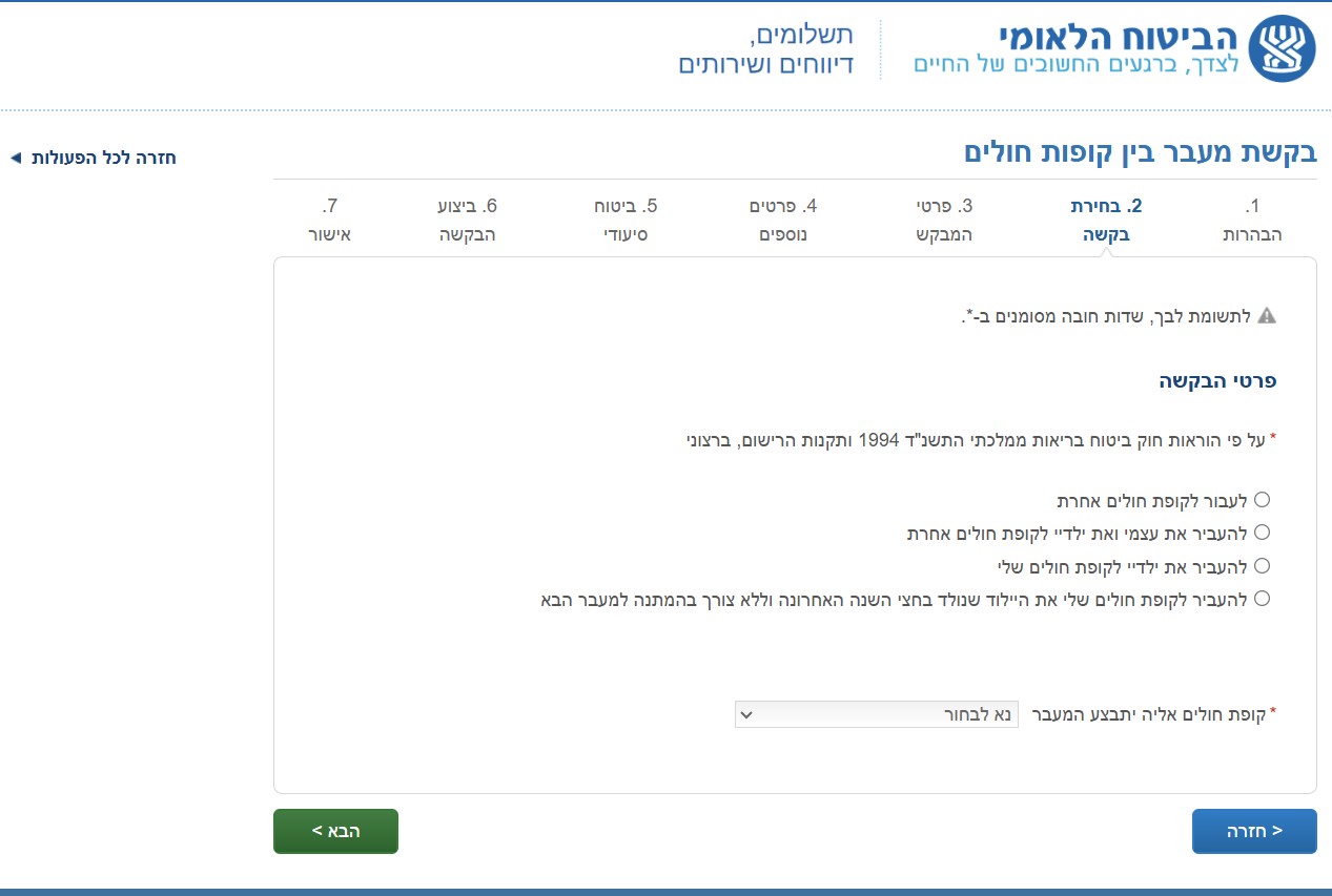 Beyond the first 14 days of your Aliyah, you can switch your Kupat Cholim online through the Bituach Leumi website. Please note that the service is only available in Hebrew. The service is available at this link . From the home page, choose the option Bakasha l’rishum/Maavar l’kupat cholim (the green rectangle on the bottom right).