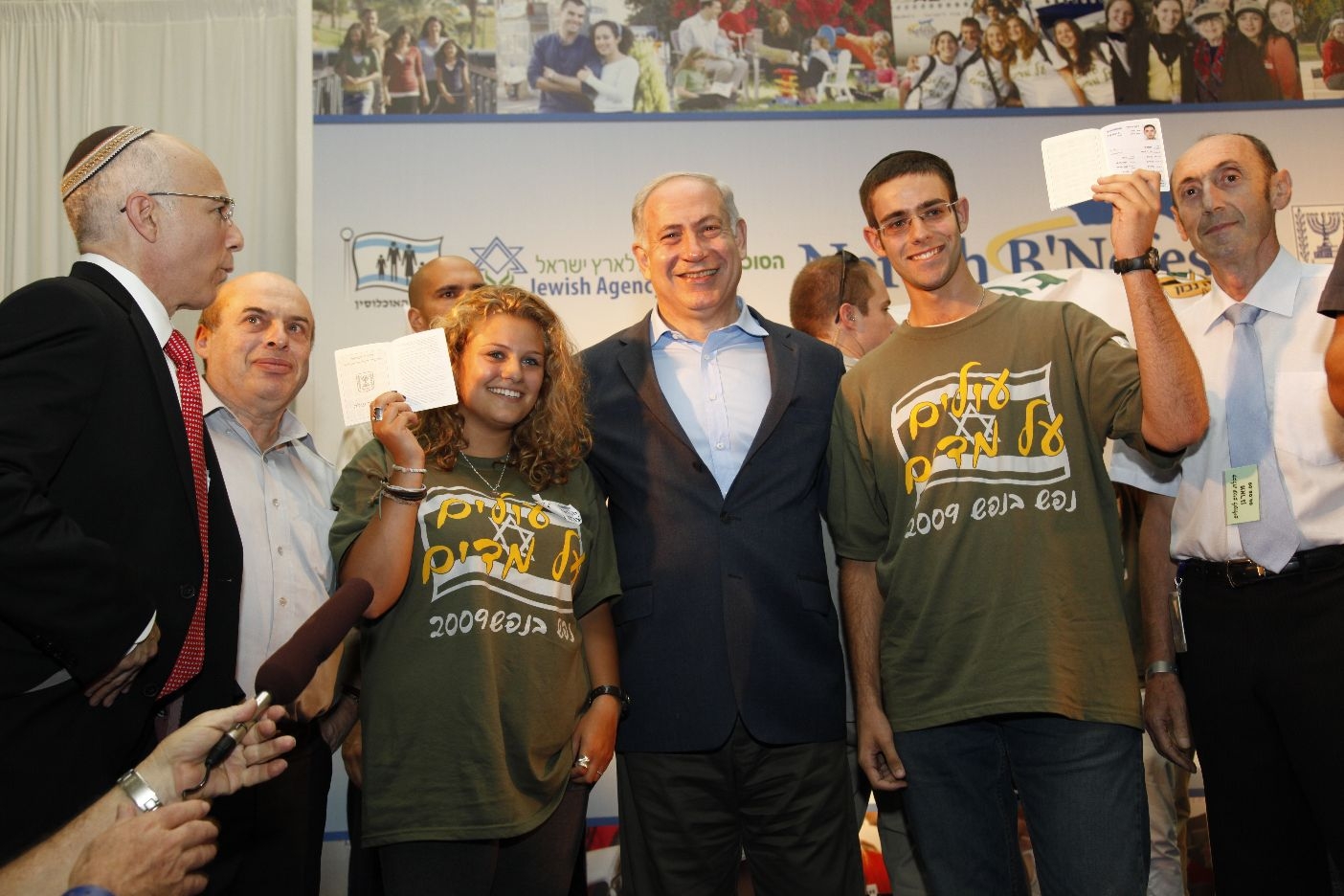 The second flight this summer orchestrated by Nefesh B'Nefesh and the Jewish Agency was greeted by Prime Minister Benjamin Netanyahu in Tel Aviv on Tuesday. The flight of 238 new immigrants from the U.S. and Canada included 55 young men and women about to join the Israeli army. Pictured left to right: Tzvi Mark from Maryland, Jewish Agency chairman Natan Sharansky, Sophie Lee from New York, Netanyahu, and Tony Gelbart. |