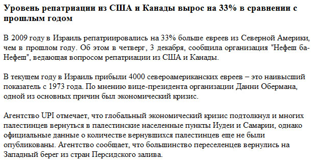 בשנת 2009 עלו לישראל 33% יותר יהודים מצפון אמריקה, מאשר בשנה שעברה. כך דיווח ביום חמישי, ה-3 לדצמבר, הארגון "נפש בנפש", העוסק בעלייתם של יהודי צפון אמריקה. השנה הגיעו 4000 יהודים מהאזור הנ"ל - הנתון הגבוה ביותר מאז 1973. לדעת סגן נשיא הארגון דני אוברמן, אחת מהסיבות המרכזיות הוא המשבר הכלכלי.
