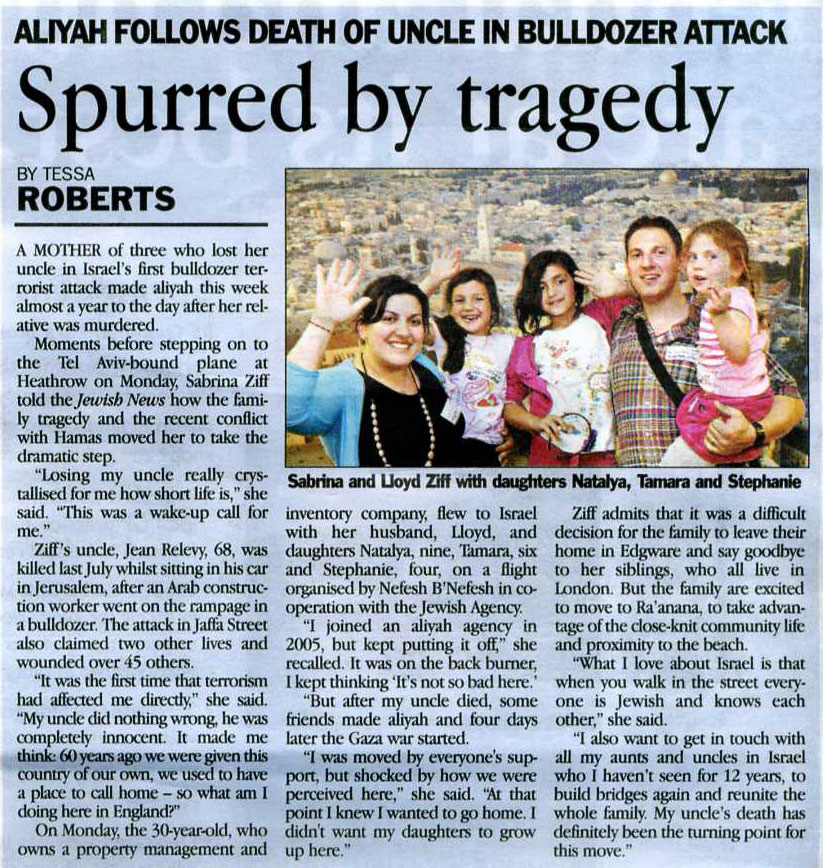Ziff's uncle, Jean Relevy, 68, was killed last July whilst sitting in his car in Jerusalem, after an Arab construction worker went on the rampage in a bulldozer. The attack in Jaffa Street also claimed two other lives and wounded over 45 others.