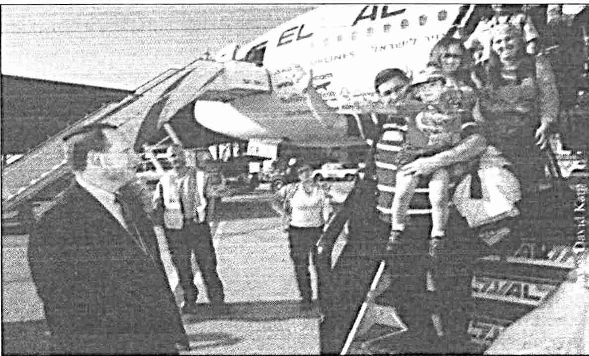 Rabbi Yehoshua Fass (I), founder of Nefesh B'Nefesh, welcomes Gilad Zuller, held by his father, Yehuda, of Staten Island, as they arrive at Ben Gurion Airport in Israel. The family is among 232 North American Jews who immigrated to ferae/ on July 7.
